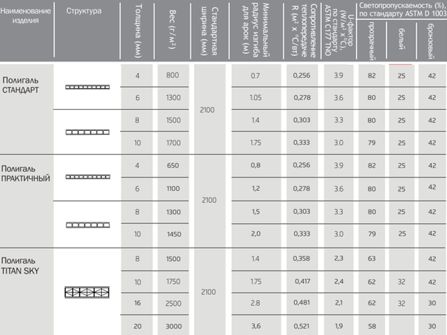 Характеристики стільникового листа полікарбонату «Полігаль» протягом кількох десятків років ретельного вивчення і практичного використання матеріалу склалися не випадково. Кожна товщина листа розрахована на певне навантаження, під неї існують норми відстаней опор для надійності і стійкості конструкції. Саме тому дані листи називаються «СТАНДАРТ ГОСТ».